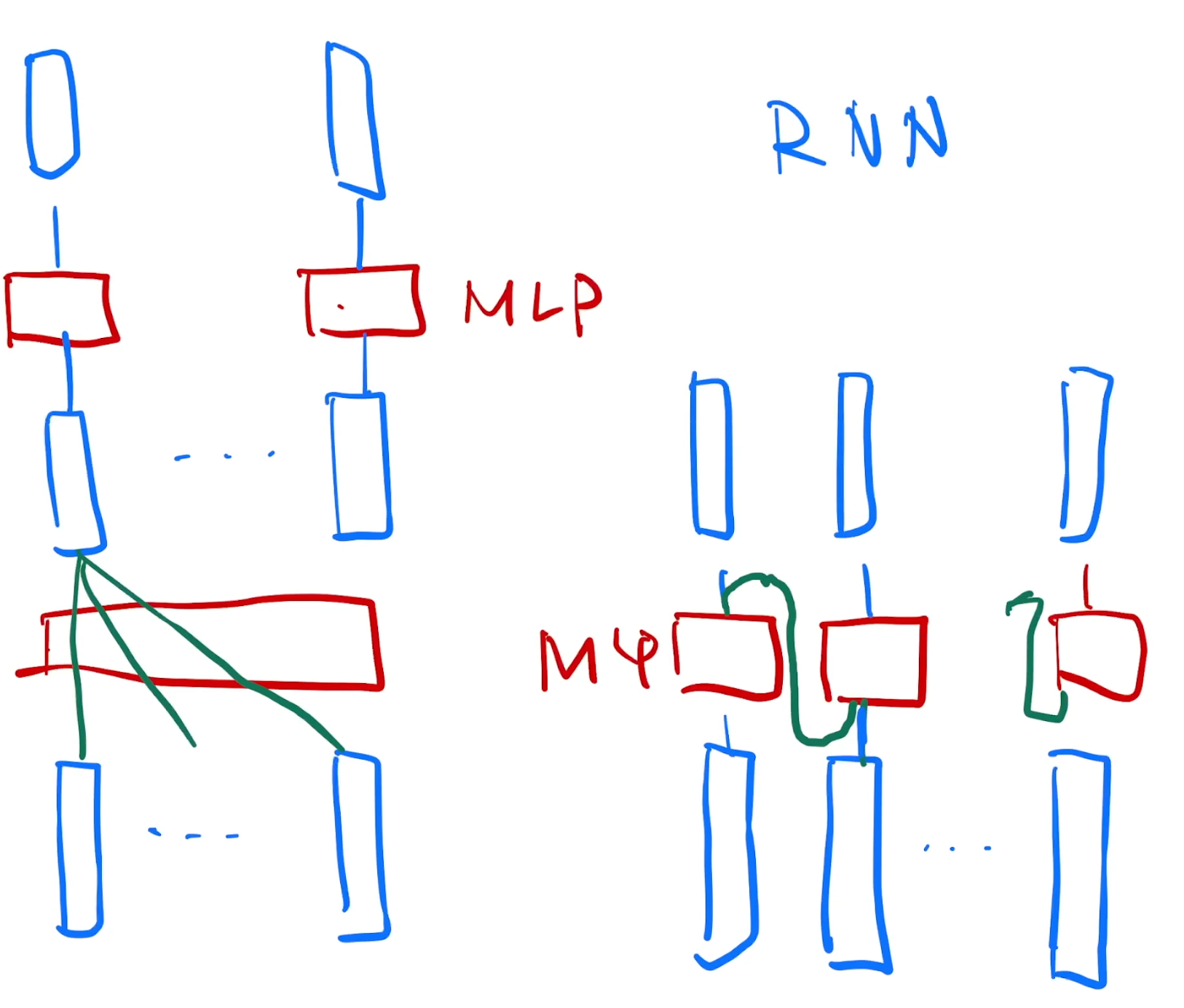 Transformer 通过一个 attention 层,去全局的拿到整个序列里面信息,再用 MLP 做语义的转换。 RNN 是把上一个时刻的信息输出传入下一个时候做输入。 - 全局信息处理:Transformer 能够通过其注意力机制 (attention) 一次性考虑整个序列的信息。 - RNN 则通过逐步处理序列并在每个时间点传递信息,把上一个时刻的信息输出传入下一个时候做输入来实现。