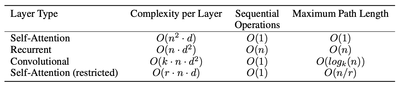 - 卷积层和受限自注意力的路径长度取决于卷积核大小和近邻的范围。